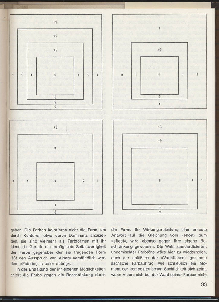 1954 und 1955 dozierte Albers außerdem als Gastprofessor an der von Max Bill gegründeten Hochschule für Gestaltung in Ulm, die sich an den Lehrmethoden des Bauhauses orientierte. Als Albers wichtigstes theoretisches Werk gilt das 1963 bei Yale University Press erschienene Buch Interaction of Color, in dem er die Ergebnisse seiner jahrzehntelangen Forschung über die Wirkung von Farbe und Form festhielt.