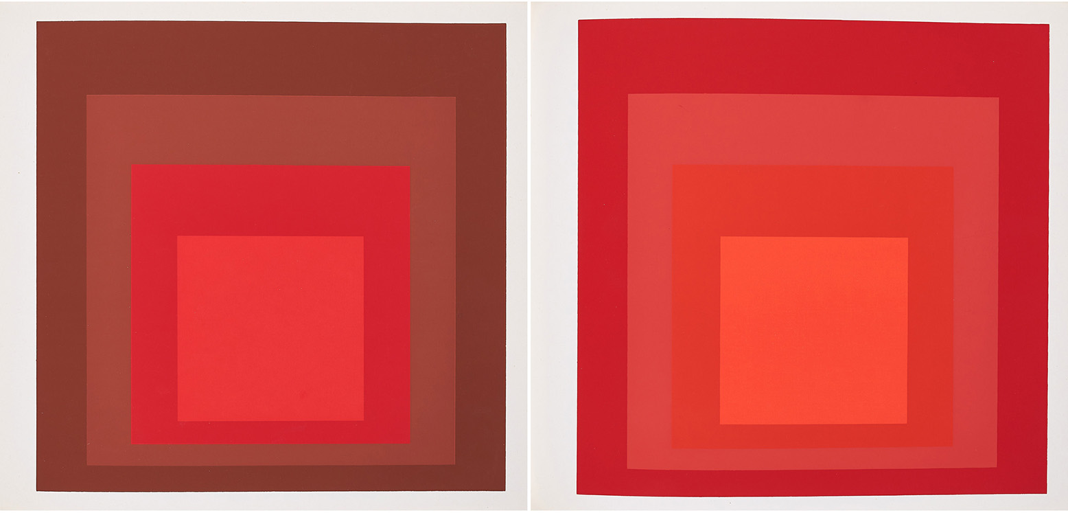 In Homage to the Square erforscht Albers die optische Wahrnehmung und das Zusammenspiel von Farben in verschiedenen Konstellationen sowie die unterschiedlichen Farbphänomene. Albers wählte das Quadrat als Ausgangsform, weil er „den geringstmöglichen Aufwand, die Beschränkung auf das geometrische Element“↓[3] anstrebte. Schon am Bauhaus lehrte Albers seinen Studenten, das Verhältnis von „Aufwand“ und „Wirkung“ unter dem Begriff „Ökonomie der Mittel“↓[4] zu optimieren. Obwohl Albers durch die Wahl des Quadrats als Bildgegenstand mit Künstlern wie Malewitsch oder Mondrian in der Tradition der Moderne steht, gilt er als Vorbereiter der Hard Edge Malerei und durch seine serielle Arbeitsweise auch als Wegbereiter der Minimal Art. Durch seine Erforschung der visuellen Wahrnehmung wurde er neben Victor Vasarely auch zum wichtigsten Wegbereiter der Op-Art. Albers selbst begründete das Arbeiten in Serie damit, dass „es nicht nur eine einzige Lösung gibt für ein ästhetisches Problem.“↓[5] Für die Bilder der Serie Homage to the Square verwendete Albers ausschließlich industriell hergestellte Farben, deren genaue Bezeichnung er auf der Rückseite jedes Bildes vermerkte. Obwohl das Konzept der drei oder vier ineinander greifenden Quadrate auf den ersten Blick starr erscheint, wird die außerordentliche Komplexität des Werks bei der Betrachtung verschiedener Variationen deutlich. Albers nutzt die einfache Ausgangsform, um die nahezu unendlichen Farbbeziehungen und Wechselwirkungen der Farben darzustellen. In seinem 1963 erschienenen Buch zur Farbtheorie Interaction of Color schreibt Albers in der Einleitung: „In visual perception a color is almost never seen as it really is - as it physically is. This fact makes color the most relative medium in art. In order to use color effectively it is necessary to recognize that color deceives continually.“ In Homage to the Square zeigt Albers den Gegensatz zwischen der physischen Materialität der Farbe und der subjektiven Wahrnehmung der Farbe auf. In jedem Gemälde wählte er die Farben auf der Grundlage ihrer Interaktion und Beziehung zueinander aus.