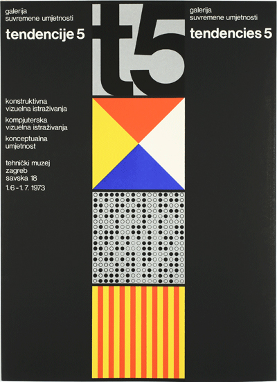 Nachdem die Bewegung der Neuen Tendenzen nach den Ausstellungen der Reihe Tendencies 4 1968/69 etwas von ihrem Schwung verloren hat, wurde 1973 mit der fünften Ausstellung Tendencies 5 ein weiterer Versuch gestartet, die Neuen Tendenzen auf eine nächste Entwicklungsstufe zu bringen. Mit dem übergeordneten Thema "The Rational and the Irrational in Visual Research" wurde in drei Rubriken ausgestellt. In der Rubrik "constructive visual research" wurden erstmals Arbeiten von zum Beispiel Victor Vasarely im Kontext der Neuen Tendenzen gezeigt. Im Bereich "computer visual research" stand der Galerie Herbert W. Franke als Berater zur Seite und traf die Auswahl der gezeigten Künstler. In der letzten Rubrik "conceptual art" wurden erstmalig Protagonisten aus den USA und dem westlichen Europa zusammen mit jugoslawischen und ungarischen Künstlern präsentiert. Etwa drei Jahre vor der Eröffnung der Ausstellung Tendencies 5, wurde die Ausstellung „Software - Information Technology: Its New Meaning for Art“ eröffnet. Die Ausstellung die vom Künstler und Kunstkritiker Jack Burnham kuratiert wurde, fand vom 16. September 1970 bis zum 08. November 1970 im Jewish Museum in Brooklyn, New York City und vom 16. Dezember 1970 bis zum 14. Februar 1971 im Smithsonian in Washington D.C. statt.