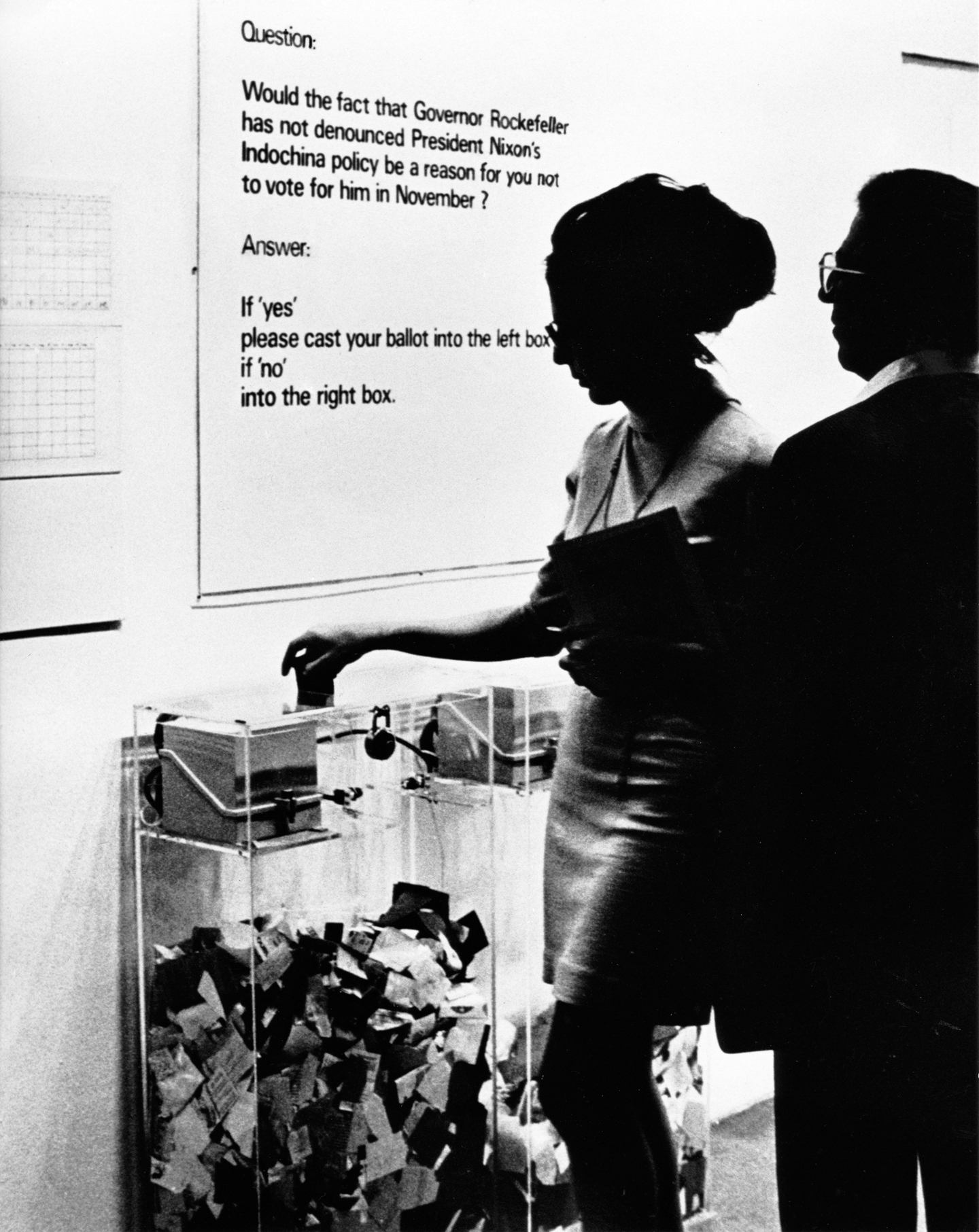 Ebenfalls beteiligt war die amerikanische Kunsttheoretikerin und -kritikerin Lucy R. Lippard, die mit ihren Texten zur Dematerialisierung der Kunst eine wichtige Rolle bei der Entwicklung der Konzeptkunst spielte. In einem 2020 im Magazin des MoMA New York erschienenen Artikel mit dem Titel "50 Years Later, a Conceptual Art Exhibition Still Courts Controversy" bezeichnete Lippard die Ausstellung als "Meilenstein", allerdings nicht, weil sie die erste ihrer Art war, sondern weil sie die erste Konzeptkunstausstellung im MoMA war.↓[8] Darüber hinaus stellte die Ausstellung eine drastische Abweichung von der üblichen Linie des Museums dar. Ein Großteil der ausgestellten Werke war prozessorientiert, viele Arbeiten waren politisch und erforderten die Beteiligung der Besucher. Hans Haackes berüchtigte Installation mit dem Titel "MoMA Poll" forderte die Besucher der Ausstellung auf, über die Frage "Wäre die Tatsache, dass Gouverneur Rockefeller Präsident Nixons Indochina-Politik nicht angeprangert hat, ein Grund, im November nicht für ihn zu stimmen?" mit Ja oder Nein abzustimmen. Da Nelson Rockefeller ein wichtiger Geldgeber und Vorstandsmitglied des MoMA war, kritisierte Haacke damit gleichzeitig die politischen Verbindungen des Museums, in dem die Installation ausgestellt wurde. Am Ende der Ausstellung wurden etwa doppelt so viele Ja-Stimmen wie Nein-Stimmen abgegeben. Haackes Installation gilt als ein frühes Beispiel für Institutionskritik in der Kunst.↓[9]