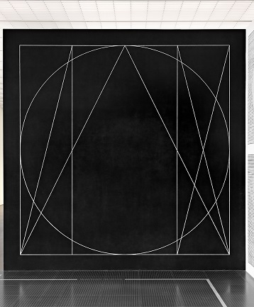 In den 1970er Jahren erweiterte LeWitt sein Formenrepertoire erneut und integrierte geometrische Formen. Diese beschränkten sich zunächst auf Primärformen, die er als Kreis, Quadrat und Dreieck definierte, doch schon bald ergänzte er Sekundärformen wie Rechteck, Trapez und Parallelogramm. Diese sechs (später neun) geometrischen Formen werden in LeWitts Wandzeichnungen von da an immer wieder verwendet, so zum Beispiel im Wall Drawing #295. Die Instruktion für dieses Wall Drawing lautet: „Six white geometric figures (outlines) superimposed on a black wall.“ Neben den geometrischen Formen kommt hier auch die Überlagerung zum Einsatz, die LeWitt bereits in seinen frühen Wall Drawings zur Erweiterung der Kombinationsmöglichkeiten von geraden Linien nutzte. Die von LeWitt definierten Primär- und Sekundärformen werden innerhalb des Quadrats überlagert, wodurch strukturelle Gemeinsamkeiten der Formen sichtbar werden.↓[15]