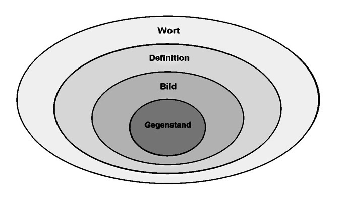 Die Beziehung, die die Alltagssemantik zwischen den vier Elementen (Begriff "Stuhl", Wörterbuch-Definitionen, Gegenstand und Abbild) herstellt, kann als eine bestimmte Beziehung von semantischen Feldern zueinander dargestellt werden, nämlich als Inklusion.↓[19]