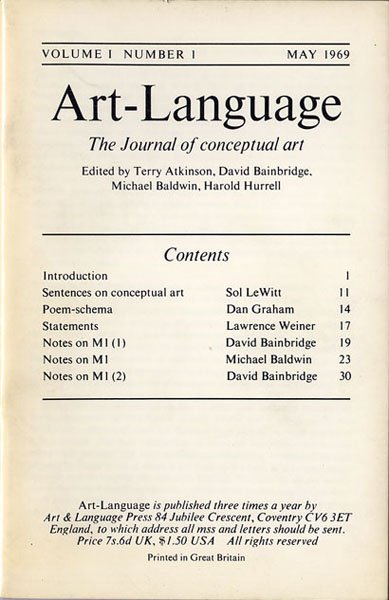 Noch radikaler in ihrem Ansatz ist die englisch-amerikanische Künstlergruppe Art & Language, die weitestgehend davon absieht, Kunstwerke im traditionellen Sinn zu produzieren. Stattdessen präsentieren sie ihre kunsttheoretischen Schriften selbst als Kunstwerk. Ihren Ursprung hat Art & Language in der Zusammenarbeit von Terry Atkinson und Michael Baldwin, die sich 1966 als Studenten am Coventry College of Art kennen lernten. Bald schlossen sich weitere Mitglieder dem Künstlerkollektiv an, und 1968 gründeten sie den Verlag "Art & Language Press" in Cambridge, wo sie ein Jahr später ihre erste Publikation, die Zeitschrift "Art - Language", herausbrachten.↓[28] In der ersten Ausgabe von „Art - Language“ wurden u.a. Sol LeWitts „Sentences on conceptual art“ und Lawrence Weiners "Statements" veröffentlicht. Die frühen Ausgaben von „Art - Language“ übten bedeutenden Einfluss auf die Entwicklung der Konzeptkunst in den Vereinigten Staaten und in Großbritannien aus.