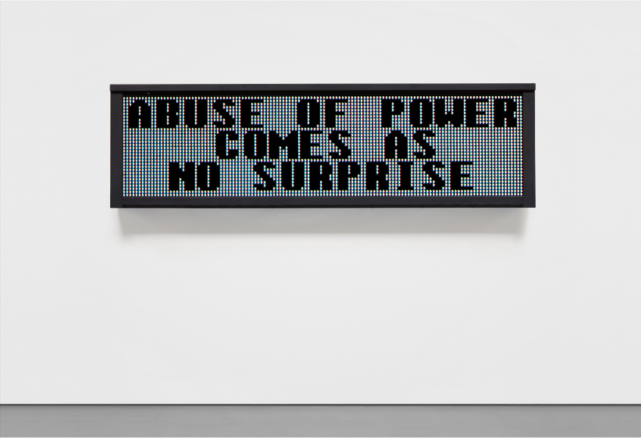 Als Pionierin in der Nutzung öffentlicher Kunst als soziale Intervention war sie eine der ersten Künstlerinnen, die Informationstechnologie als Plattform für politischen Protest nutzten. Ihr Erfolg hat eine ganze Generation von Künstlern ermutigt, öffentliche Plattformen im Cyberspace und im realen Raum zu schaffen, um politische Ansichten zu verbreiten.↓[34] Jenny Holzer ist seit 2019 ebenfalls in den Künstlerräumen des Tate Modern in London vertreten. Die Ausstellung zeigt einige der bedeutendsten Werke ihrer Karriere, darunter Zeichnungen aus der Serie "Diagrams" von 1976 oder Stücke aus der Serie "Truisms", aber auch unbekannte Arbeiten. Begleitend zu der Präsentation ihrer Werke wurde in enger Zusammenarbeit mit der Künstlerin ein besticktes Geschirrtuch exklusiv für die Tate geschaffen.↓[35]